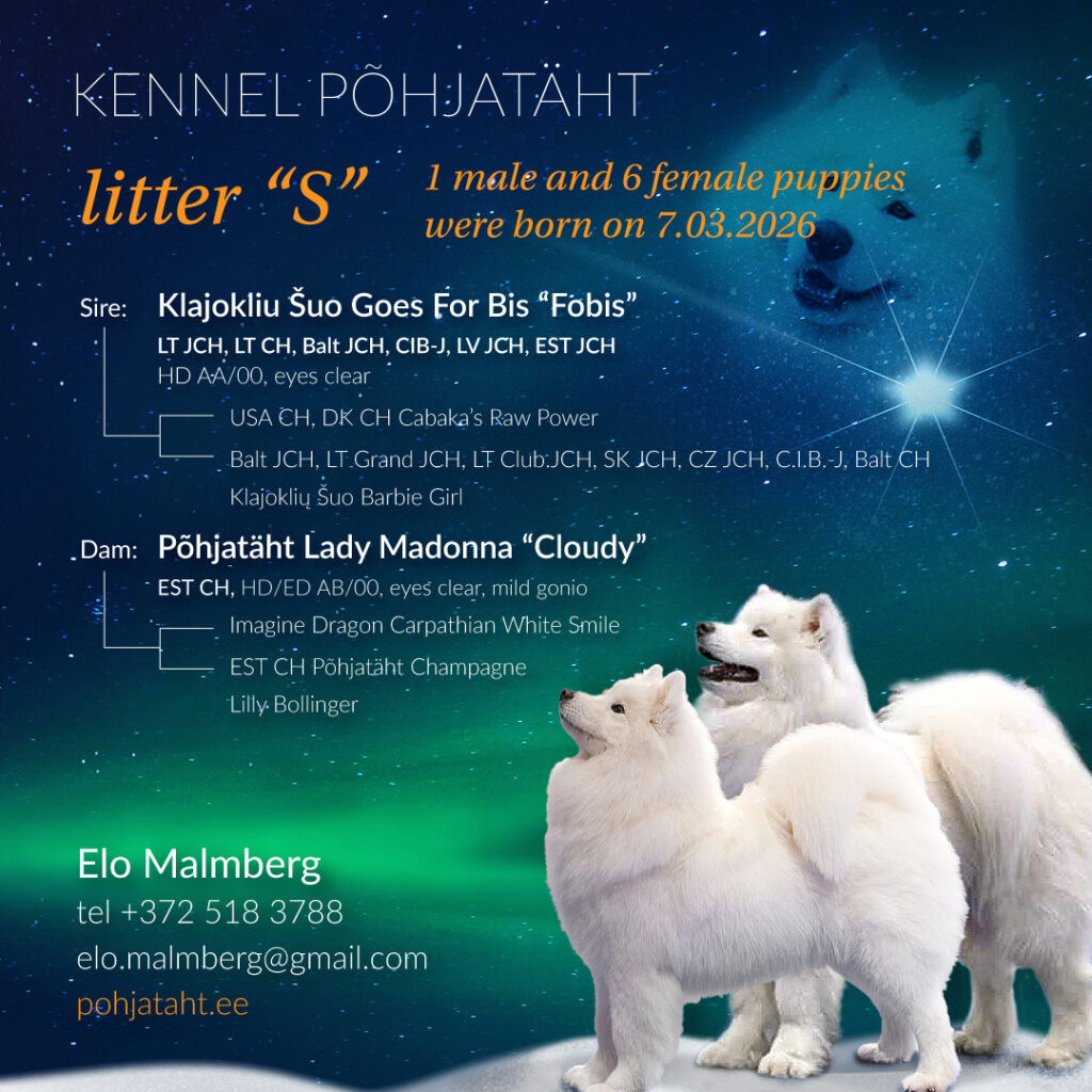 Seitse väikest samojeedihakatist nägid kennelis Põhjatäht ilmavalgust 7.märtsil. Pesakonnas on üks isane ja kuus emast kutsikat. Pesakonna ema Cloudy on ka Põhjatähe Oriental pesakonna ema. Pesakonna isa Fobis on Leedu iludus. Mõlemad vanemad on välimikutšempionid. Mõlemale vanemale on tehtud kõik nende elukohariigis nõutavad terviseuuringud suurepäraste tulemustega. Vanemate registriandmeid näed, klikkides nende nimedele: